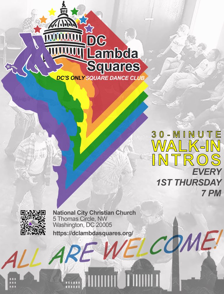 The ONLY square dance club in Washington, DC. DC Lambda Squares welcomes singles, couples, of any orientation. We provide an energetic activity that encourages smiles, promotes friendship, and is a ticket to the hip, social world of square dancing. All are welcome to come and dance with us.